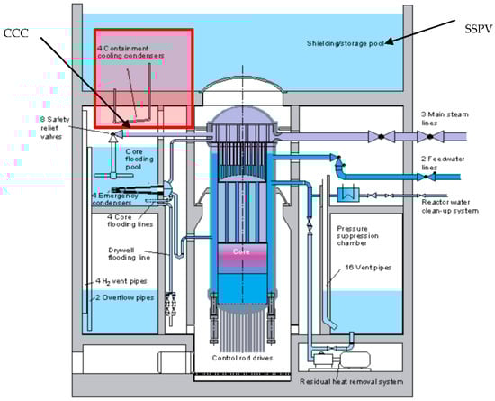 Since the middle of the 1980s, it has been recognized that the application of passive safety systems can contribute to improving the economics and reliability of nuclear power plants. In some advanced designs, natural circulation is used as a means for residual heat removal. For example, in a German BWR (boiling water reactor) concept, namely, the KERENA™ reactor [], the containment cooling condenser (CCC) is the key component of a natural cooling circuit; see the red shaded region in Figure 3. In the case of overpressure, surplus steam in the containment condenses on the outside wall of CCC. Heat released by condensation is transferred to the cooling water inside the CCC tubes and finally to the shielding/storage pool vessel (SSPV) through natural circulation.