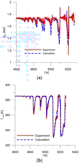 Comparison between calculation and experiment: (a) inlet pressure; (b) outlet temperature.