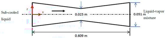 The experimental investigation of water flashing through a converging-diverging nozzle presented in [] has been widely used as a reference for numerical study or model development, e.g., [,]. In the frame of this work, several tests with different boundary conditions, such as inlet pressure, temperature and outlet pressure, are reproduced by means of CFD technology. The geometrical sketch of the circular nozzle is shown in Figure 6. Dynamic pressure decreases with the reduction of channel area in the converging part leading to a decrease in the saturation temperature. If it falls below the liquid temperature before reaching the neck position, the onset of flashing will occur near the neck and vaporization continues in the diverging part.