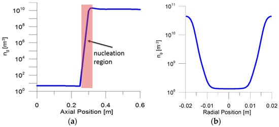 Distribution of bubble number density in (a) the axial direction and (b) the radial direction at x = 0.458 m.