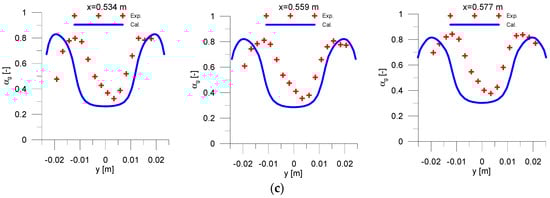 Comparison between calculation and experiment: (a) axial profile of the pressure and void fraction; (b) radial profile of the void fraction; (c) radial profile of the void fraction at different axial positions.
