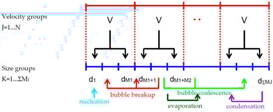 - Krepper, E.; Lucas, D.; Frank, T.; Prasser, H.-M.; Zwart, P.J. The inhomogeneous MUSIG model for the simulation of polydispersed flows. Nucl. Eng. Des. 2008, 238, 1690–1702. [Google Scholar] [CrossRef]