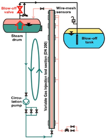 During the pressure release experiment, water was circulated with a velocity of about 1 m/s and flows upwards through the test section; see Figure 12. The transient pressure course is controlled by the blow-off valve located above the steam drum, where saturation conditions are always guaranteed. As a result, cavitation in the circulation pump below is avoided. At the same time, the maximum evaporation rate in the test section is limited [].