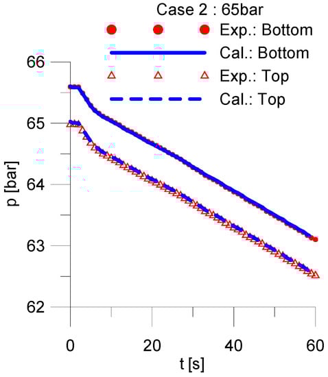 The problem investigated in the present work has initial conditions of 7.00 MPa and 513.7 K. A pressure boundary was assumed for the outlet, and the background pressure was 1 atm. The simulation is done on a 3D cylinder grid, and furthermore, the five-equation model mentioned above with the prescribed bubble diameter (dg = 1 mm) as in [] is applied. The results of absolute pressure and void fraction at the position x = 1.469 m are presented in Figure 2a,b and compared with the experimental data.