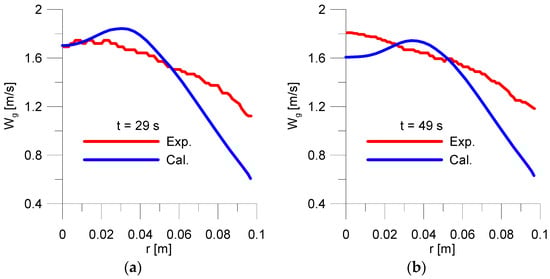 Evolution of radial gas velocity profiles at the WMS plane (Case 2): (a) t = 29 s; (b) t = 49 s.