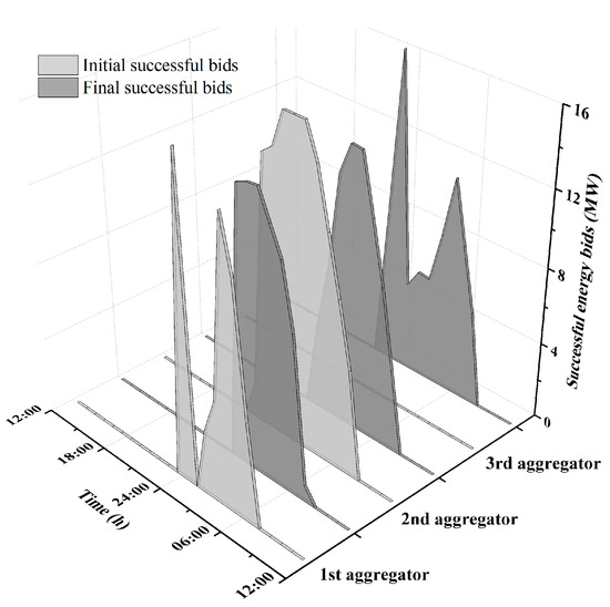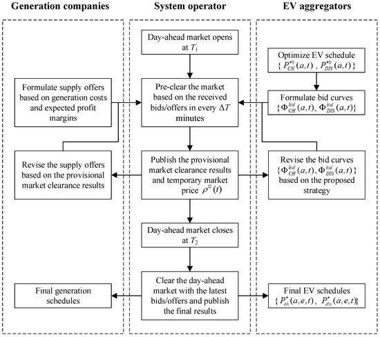 - The bidding clearing system clears the day-ahead market after T2, and publishes the final market clearing results. The EV aggregators will formulate the detailed charging and discharging schedules, denoted as {, }, for each EV concerned based on the final successful bids.