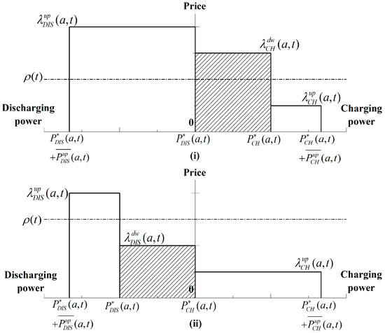Thus, and can be obtained through (33) and (36), as well as Figure 2. and are very expensive compared with the average day-ahead energy prices, and this makes the bid prices for discharging much higher than that for charging. In general, it is only possible for the EV owners to discharge their batteries in real-time, balancing or ancillary service markets for high prices to compensate the discharging costs. Nonetheless, the bid prices in (33) and (36) are applicable not only in day-ahead market, but also in real-time and ancillary service markets.
