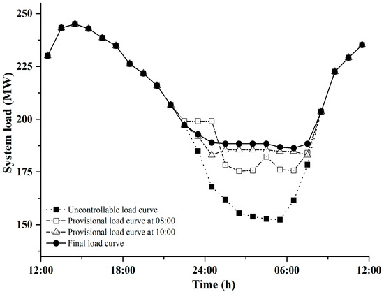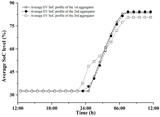 A typical load curve with an afternoon peak of 245.1 MW and a night valley of 152.3 MW is selected as the uncontrollable load profile. The maximum charging load of all EVs is 49.5 MW, and is around 20% of the maximum uncontrollable load. , , and in (30) and (31) are all set to 1 (the most optimistic value). The day-ahead market opens for bids/offers during 08:00~12:00, and the bidding clearing system publishes the provisional market clearance results in every half hour. The system load profiles during the bidding process are demonstrated in Figure 3. The error between the final cleared results and the provisional market clearing results at 11:00 is less than 1.0%, which means that the bidding process converges in six iterations. Three EV aggregators are assumed to have different market forecasts at the beginning of the day-ahead market bidding period, and are demonstrated in Figure 4 with the final day-ahead market clearing price. Their temporary cleared energy bids at 08:00 and final cleared bids after 12:00 are shown in Figure 5. The average SoC profile of each EV aggregator based on the final cleared day-ahead market bids is demonstrated in Figure 6.