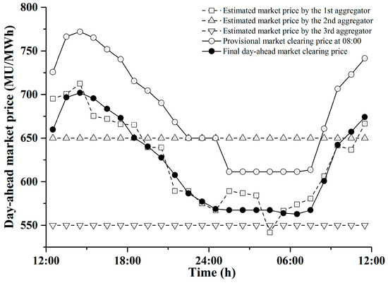 Benchmark II: Day-ahead market clearing without the proposed bidding clearing display procedure, while each EV aggregator bids with the information of the final market price as described in Figure 4. The optimal energy schedules of aggregators are obtained based on the final market price, and the single block bid price for the optimized charging power is set to 1000 MU/MWh.