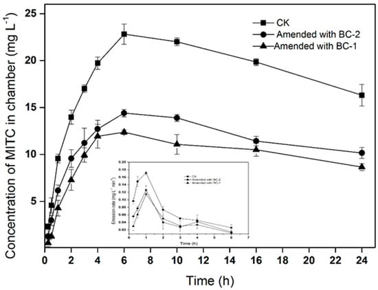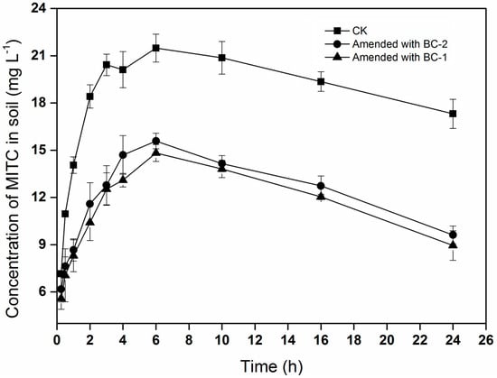 The trend of MITC concentrations in the soil was similar to that in the chamber air, increasing initially and then declining with time (Figure 2). The concentrations of MITC in the soil treated with biochar (BC-1 or BC-2) were significantly lower than in CK. The maximum concentrations of MITC were 21.5, 14.8, and 15.6 mg·L−1 in the CK, BC-1, and BC-2 treatments, respectively. These results showed that biochar amendments could reduce the concentrations of MITC in the soil, potentially reducing its efficacy for controlling soil-borne pests.