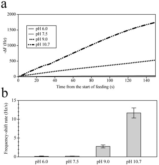 The QCM response was studied using palmitic acid at different pH levels in the range of 6.0–10.7 to understand the effects of acid dissociation. Figure 2a illustrates typical patterns of frequency shifts at pH values 6.0, 7.5, 9.0, and 10.7 during QCM measurements of 100 mg/L palmitic acid in water. The frequency-shift of the QCM sensor is considered as a mass change of the electrode caused by the absorption of palmitate. The frequency-shift patterns always show linear decreases, except in the initial period. Although in most cases researchers use the values of frequency change after a given period of time, a measurement using a flow cell shows a lag time before sample reach a QCM disc, sometimes resulting in destabilization in sensor response at initial period. Therefore, the absolute values of the slopes of regression lines were calculated using linear portions of frequency curves (basically in the range from 50 s to 150 s) in this study. The bars shown in Figure 2b are the averages of the slopes, indicating decreasing rates in the frequencies. As shown in these figures, the frequency-shift rates are considerably increased in the pH range of 7.5–10.7, crossing the pKa value. The total water-solubility of the palmitic acid including dissociated and nondissociated form () depends on the pH. The is determined as follows [25]: