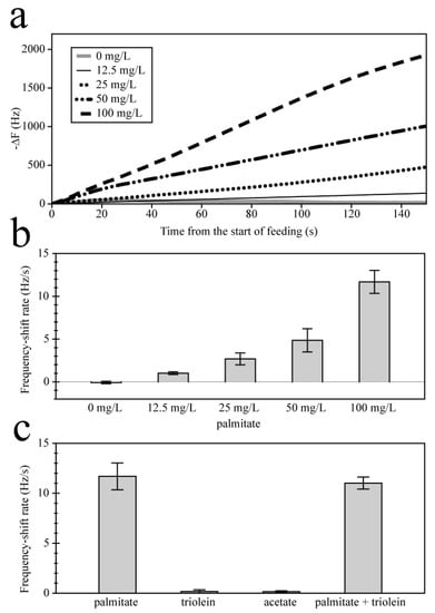 (a) Typical frequency change patterns during QCM measurements using different concentrations of palmitate; (b) absolute values of average frequency-shift rates (n = 3) within the linear ranges (50–150 s) at each palmitate concentration; and (c) absolute values of average frequency-shift rates (n = 3) within the linear ranges (50–150 s) obtained from solutions of different model compounds.