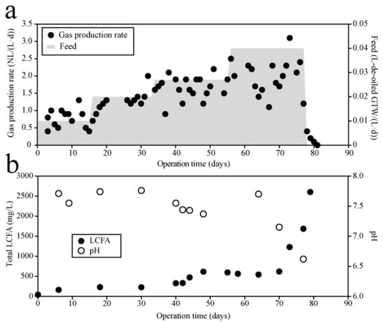(a) Time courses of gas production rates and feeding rate of de-oiled grease trap waste (GTW); and (b) The change of pH and long-chain fatty acids (LCFA) concentration during the semi-continuous experiment.