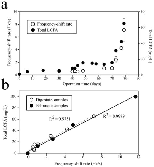(a) Time courses of QCM frequency-shift rates (n = 3) and LCFA concentrations of anaerobic digestate samples; and (b) Comparison of relationships between frequency-shift rates and LCFA concentrations in digestate and palmitate samples. Total LCFA values in Figure 5 are the concentrations of diluted samples before measurements.