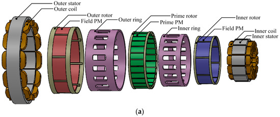 Proposed structure of double-stator permanent magnet machine integrated with a triple rotor magnetic gear: (a) Exploded view of machine components; (b) Structural view of integrated machine.