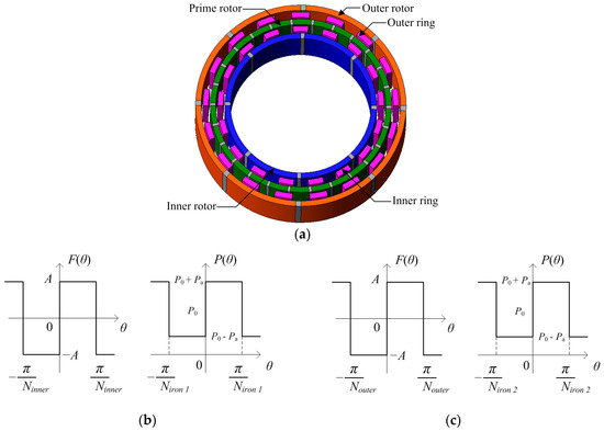 Structure of magnetic gear with three rotors: (a) Configuration of the triple-rotor magnetic gear; (b) Magnetomotive force and permeance distribution of the inner gear; (c) Magnetomotive force and permeance distribution of the outer gear.