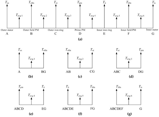 Torque analysis of DS-MGM: (a) Torque distribution between parts; (b) Outer stator and outer field PM; (c) Outer field PM and outer iron ring; (d) Outer iron ring and prime PM; (e) Prime PM and outer iron ring; (f) Inner iron ring and inner field PM; (g) Inner field PM and inner stator.