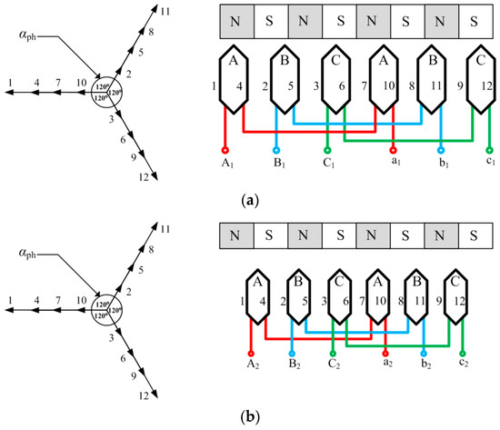 The outer and inner stators are both designed with fractional slots and concentrated windings. Fractional slot windings have advantages over distributed windings because they reduce the end-winding lengths, torque ripple [26], coil volume and copper losses, machine axial length, and increased slot fill factor [27,28]. The calculated slot-per-phase-per-pole q = 1/2 and q < 1. Therefore, a double-layer concentrated winding scheme is adopted for both inner and outer stators, which have two coil sides per slot and separate phases. The slot-vector star method is used to determine the correct coil winding connections shown in Figure 8a,b. The key is to achieve the largest amplitude of the main harmonics in the induced EMF and achieve equal EMF waveform in the three phases. The machine periodicity t can be expressed as: