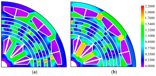Magnetic flux density distribution: (a) Without load; (b) With load.