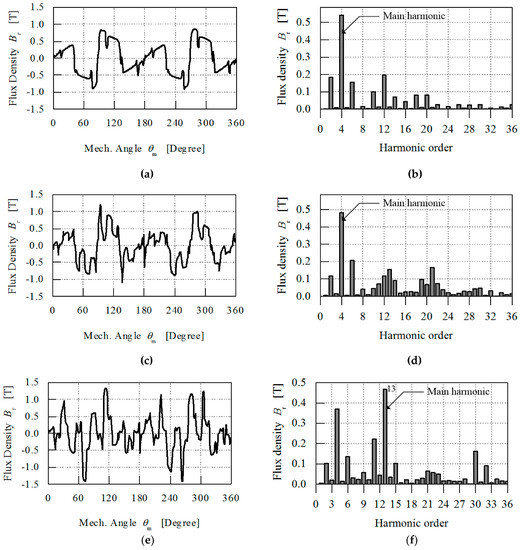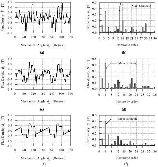 The Fast Fourier Transform (FFT) was used for the harmonic spectrum analysis of the magnetic flux density at the centre of the magnetic gear’s three inner air-gaps. Figure 11a illustrates the radial component of the magnetic flux density between the inner field PMs and inner stator, while Figure 11b shows its harmonic order. The number of flux density pulsations is eight, which corresponds to the number of poles of field PMs. Also, the main harmonic number is four, equal to the field PMs pole-pair number. Figure 11c shows the radial component of the flux density at the centre of the air-gap between the prime PMs and inner iron ring, while Figure 11f shows the harmonic order.