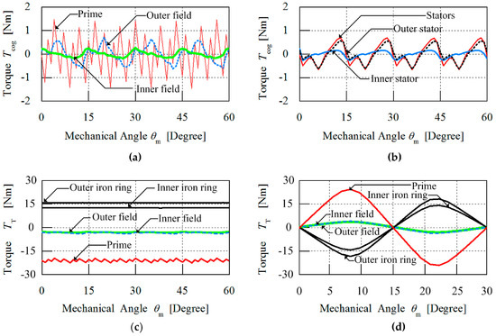 The cogging torque and transmission torque characteristics of the DS-MGM: (a) Cogging torque generated by iron rings of the magnetic gear; (b) Cogging torque generated by stator slots of the machine; (c) Transmission torque of the magnetic gear; (d) Pull-out torque angle curves.