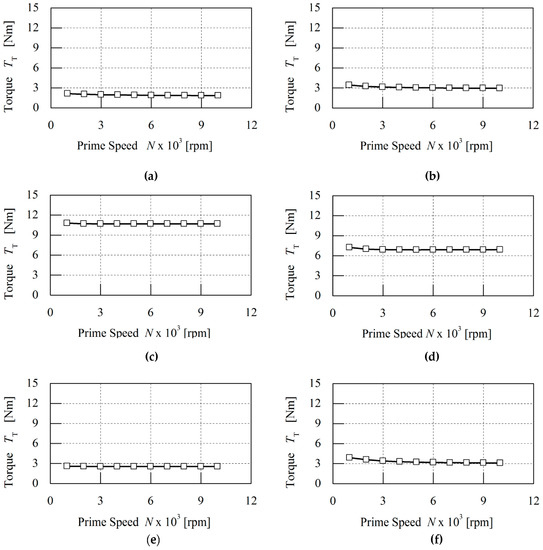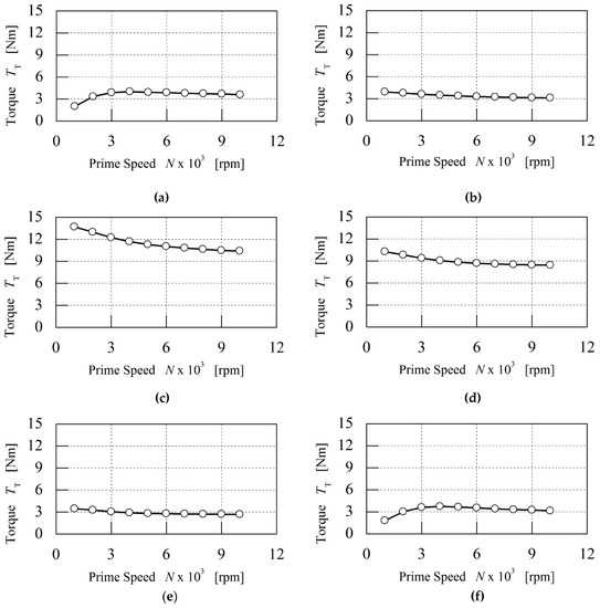 The torque distribution characteristics without load between the outer stator and outer field PM shown in Figure 15a are similar to the torque distribution between the inner stator and inner field PM. At a prime rotor speed of 300 rpm maximum torque is achieved and the line curve dips slightly at speeds greater than 1000 rpm. The torque distribution between the prime PM and outer iron ring illustrated in Figure 15c,d is greater than the torque between the inner field PM and inner iron ring because the prime rotor has twenty-six poles of prime PMs compared to the eight poles of field PMs. Also, the magnetically coupled configuration confirms that the torque generated by the low-speed prime PM rotor is greater than the torque on the high-speed PM rotors. It can be observed that, as angular speed increases, the transmission torque reduces as a result of eddy current losses from the PMs and iron losses in the stationary iron rings. In Figure 15f the distribution torque between the inner stator and inner field PM uniform acts as a counter torque against the torque between inner iron ring and inner field PM shown in Figure 15e.
