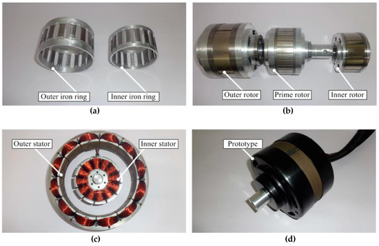 The fabricated components and prototype of DS-MGM: (a) Iron rings; (b) Rotors; (c) Stators; (d) Assembled prototype.