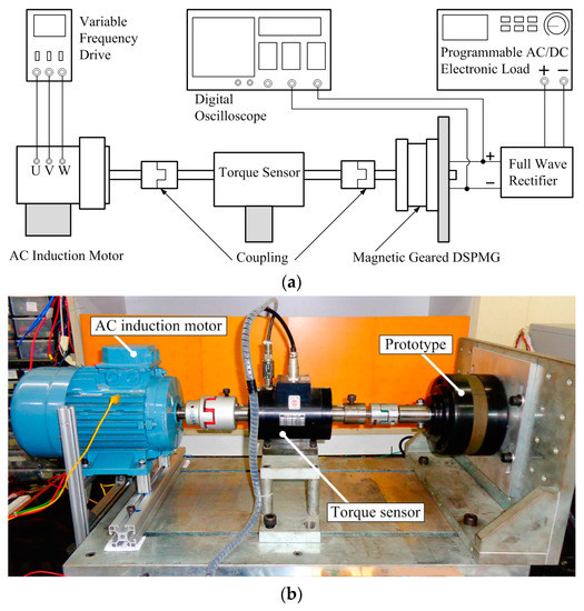 Figure 17 illustrates the fabricated components of the proposed machine, including the assembled prototype. The mechanical assembly of the DS-MGM is quite complex because all three PM rotors rotate separately and both modulating iron rings have to be fixed between the three rotors with an airgap of 1 mm. The bone rotor structure is used in designing the three rotors so that a magnetically coupled configuration is achieved between the magnetic gear and double-stator PM machine. The two modulating iron ring pole pieces are fabricated from solid steel, while the connecting end rings are made from aluminium to avoid short-circuiting the magnetic flux; since the proposed machine is designed for low-speed operation, the effect of eddy current losses is ignored. Future work could investigate the effect of laminated iron rings on eddy current losses at high-speed operation. The input shaft is machined from aluminium to reduce weight and is coupled to only the prime rotor, which results in difficulties in measuring the transmission torque for both the outer PM rotor and the inner PM rotor. To address this problem, the angular speeds of the outer and inner rotors are calculated from their fundamental frequency by spectrum analysis of the back EMF voltage produced from both outer and inner stators. The power, torque, and angular speed characteristics of the prototype DS-MGM were measured with the test rig shown in Figure 18b to verify the measured results against the calculated results. An AC induction motor was coupled to the assembled prototype generator and a three-phase variable frequency drive was used to control the AC induction motor’s speed and torque by varying the input frequency. The output terminals of the prototype generator were connected to a three-phase full bridge rectifier, while the output DC voltage, DC current, and DC power was measured with a single-phase programmable electronic load.