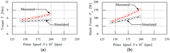 The torque characteristics shown in Figure 15 without load and Figure 16 with load indicate that there is a linear relationship between the machine’s torque and the rotational speed of the prime mover. For the analysis of the torque distribution, the slope of the line known as the torque–speed constant, kslope, is chosen as the evaluating parameter, which is similar to the power–speed constant [30]. The torque-speed constant is calculated by finding the slope of the average torque distribution between two parts when operating at different speeds. The kslope is calculated by Equation (64):