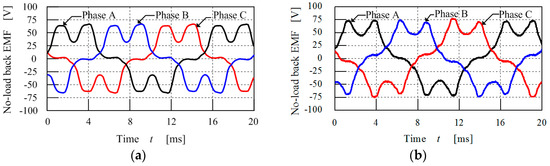 Comparison of no-load back-EMF waveforms at prime rotor speed = 300 rpm: (a) Simulated results from finite element analysis; (b) Measured results from the experiment.