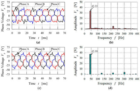 Comparison of output three-phase voltage from generator before DC rectification with load of 100 Ω at prime rotor speed = 200 rpm: (a) Simulated three-phase voltage waveform; (b) Spectrum analysis of (a); (c) Measured three-phase voltage waveform; (d) Spectrum analysis of (c).