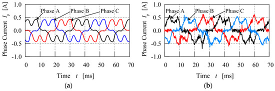 Comparison of output three-phase current from generator before rectification with load of 100 Ω at prime rotor speed = 200 rpm: (a) Simulated three-phase current waveform; (b) Measured three-phase current waveform.
