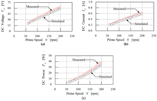 Electrical characteristics of the prototype DS-MGM with resistance load of 100 Ω: (a) DC voltage; (b) DC current; (c) DC power.