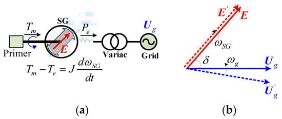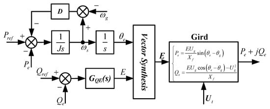 Any grid-connected device can be represented as a rotating voltage vector, i.e., an inner potential. The device’s dynamic characteristics can be described using the dynamic motion of the inner potential’s phase and magnitude. In the grid, lots of devices are integrated together, in other words, many inner potential vectors are coupled through the network. The inner potential phase and magnitude motion are driven by the input and output active (or torque) and reactive powers of the devices. The inertia of the inner potential’s phase motion reflects the inertia characteristics of the device. The well-known synchronous generator (SG) [] is taken as an example to illustrate the concept of the inner potential vector.
