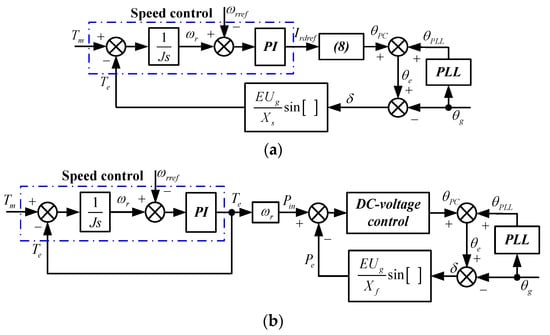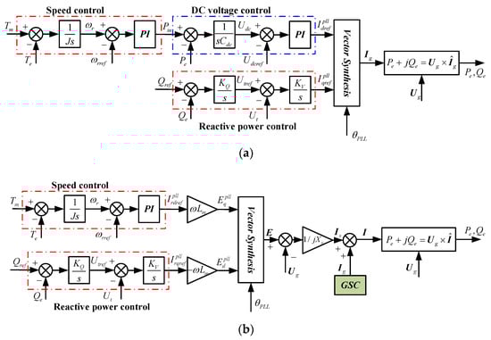 Simplified control block diagram of WTs. (a) Type-4 WTs; (b) Type-3 WTs (Xs is equivalent impedance between inner potential and grid voltage).