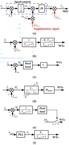 The most common and representative way for WTs to make inertial response available is to provide a supplementary signal associated with the detected grid frequency variations or its differential to the torque/power or speed reference value to be tracked as in Figure 6a, which is suitable for both type-3 and type-4 WTs [,,,,,,,,,,,].