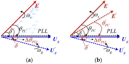 where and are controlled by the dq-axis currents components, which are decided by active and reactive power control. θPC is the phase angle between the defined inner potential and PLL’s phasor which is decided by power control.