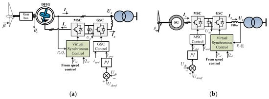 Enable inertial response of type-3 and type-4 WTs based on virtual synchronous control. (a) type-3 WT; (b) type-4 WT.