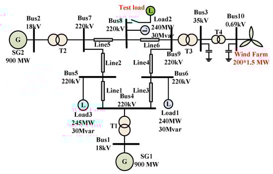 For comparing the inertial response of the inertia control methods presented in Section 5, simulations were implemented in a brief test power system by Simulink/Matlab. The test power system is established by two synchronous generators, and an aggregation model of a wind farm with 200 wind turbines driven by DFIG is established as in Figure 10.
