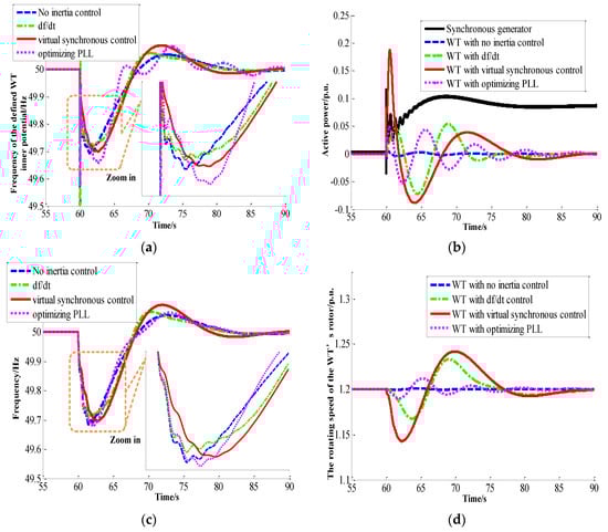 Simulation results of the WT’s inertial response, the grid frequency and the rotating speed of the WT’s rotor. (a) The dynamic response of the wind turbine’s defined inner potential with different inertia control methods; (b) The inertial response of the wind turbine with different inertia control methods; (c) The grid frequency with different inertia control methods; (d) The rotating speed of the WT’s rotor with different inertia control methods.