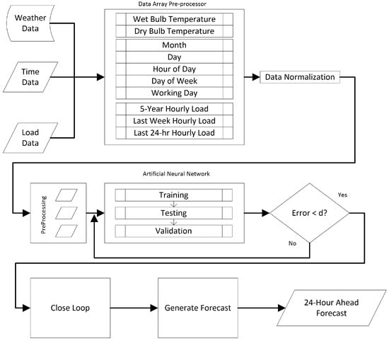 In order to generate a parsimonious model, i.e., a model that can provide sufficient forecasting accuracy with the minimum set of inputs, a statistical analysis of the correlation between input and output was carried out for each variable with respect to estimated load. Table 2 below shows the subset of parameters that yield the best performance with the smallest input set. The flowchart in Figure 2 shows the procedure for preparing and processing the data through the ANN.
