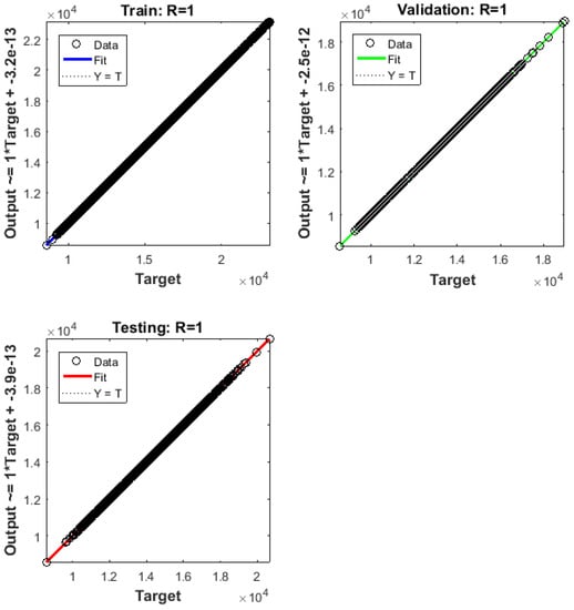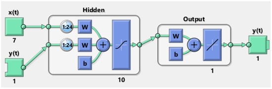 Equation (8) describes the implemented NARX neural network in this research. The open-loop and closed-loop networks are identical, except where the value of the delayed output is obtained. The open-loop network obtains the value of y from known past values of the output, and therefore, it is a regular input to the network; and the closed-loop network obtains the value from the predicted value of the output. An example of the NARX implementation can be found in [].