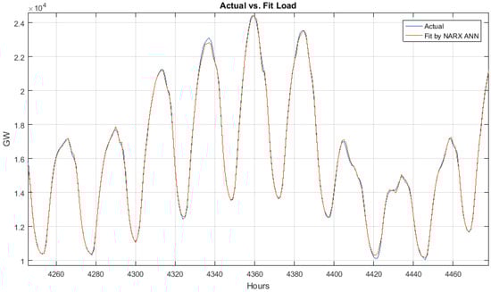 Starting with the dataset, including year, month, date, day, hour, day of the week, whether the day is a working day or a holiday, dew point temperature and dry bulb temperature, as well as hourly load, for five years, we first segment the data into one-year groups. Each one-year group is used for testing. The data are also aggregated with the last week load data (as a redundant input) and last day (24 h) also as a redundant input. The data are then prepared so that the input size matches the number of input neurons. The initial weights are assigned in order to guarantee stability, as discussed in Section 5. The resulting dataset is split into training, validation and testing sets. The training set undergoes Levenberg–Marquardt backpropagation in order to obtain the open-loop weights. Testing and validation are done on the dataset. This process is repeated 10 times each for 5–30 neurons in increments of five. At the end, the best fitting open-loop network is selected, based on the minimum MAPE criterion. The process does not guarantee an optimal solution, just the selection of the best solution available from within many different parameters. The best open-loop network is selected; the loop is closed; and the date and weather data forecast is fed to it in increments of one hour, in order to produce one-hour forecast at a time for the next 24 h. Now, the model utilizes its own output load forecast as an input to generate the next hour forecast. This is how the 24-hour forecast is obtained.