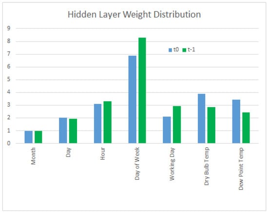 Tee [] proposes a model using a model using an MLFFN with 51 inputs, 16 hidden neurons and one output layer. The inputs include 24 dummy variables for time of day, past hour load for 24 h, one dummy variable for weekend or weekday, temperature at the hour before and month of the year. The author supports the choice of just temperature as a sole weather variable, citing [,] that wind speed, humidity and cloud cover have little influence on the performance of the ANN. The training method is a Levenberg–Marquardt back propagation algorithm. The MAPE achieved by this study is 0.439% with a maximum MAPE of 7.986% for the month of December.