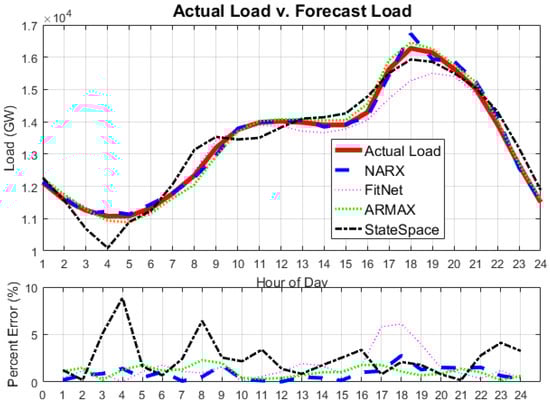 A novel implementation of a nonlinear autoregressive neural network with exogenous input (NARX) has been presented. The approach shows that an ANN can be trained in open-loop by using all of the available endogenous and exogenous inputs. Electric load has been used as the endogenous variable, and time and weather (dry bulb and dew point temperatures) are used as exogenous inputs. The network is a recursive ANN with connections between the output, hidden and input layers. The network was trained using a Levenberg–Marquardt backpropagation algorithm. Once the neural weights are calculated, the load input is disconnected, and the predicted (forecast) value of the output is fed back to the input. This isolates the network and removes the requirement for retraining for generating each instance of the output (predicted load). The accuracy of the traditional ANN network is improved to a forecast MAPE error of less than 1%. The authors have compared the proposed method with traditional statistical models ARMAX and state space, as well as the forecast calculated by a feedforward ANN with a multilayer perceptron architecture. In all three cases, the proposed NARX architecture provides a lower MAPE error. In practical terms, this translates into savings because the forecast load is used to commit power plants for power availability, and the more accurate the forecast is, the better the operations performance achieved, thus saving energy and cost. The accuracy in the forecast is very important, especially for borderline cases in which a plant start up may be delayed for an hour or even avoided altogether given a reliable forecast. Impact on a network, such as ISO New England, where the data for this research was obtained, a network with a 19.3-GW available capacity and typical demand varying from 10 GW–18 GW, could represent savings of 0.5% of the installed capacity, i.e., 100 MW for periods of time ranging between 1 and 4 h per day. These are the typical overshoot times for forecasted loads, and their predictability offers an opportunity for real cost savings.