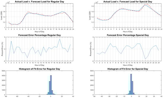 Moharari [] shows the implementation of an MLFFN ANN for forecasting short-term loads considering special days. The input to the MLFFN network includes day variables, such as weekends and holidays, as well as weather variables, such as minimum and maximum forecast temperatures, and historical loads for the past 15 days, for a total of 23 inputs. The implementation results in a forecast with an MAPE of 1.43%.