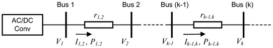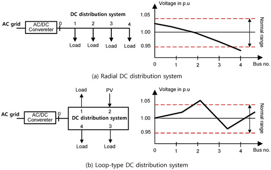In a typical radial network as shown in Figure 1a, active power flows along with the feeders in one direction from the grid to the end of the feeder. When loads increase significantly, the voltage profile can fall below the normal range. In this case, the minimum voltage occurs at the end of the feeders. Figure 1b illustrates a loop-type DC distribution system, in which all the loads have two paths to receive electric power from the grid. If DERs are integrated to this system, the voltage profile becomes more complicated than the radial system. To accurately analyze the effect of DERs to system voltage, power flow analysis must be executed.