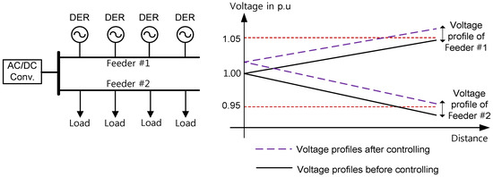 Figure 2 illustrates voltage profiles for two extreme examples of radial distribution networks. Let us assume that Feeder #1 includes only DERs distributed in the line whereas only loads are connected to Feeder #2. As seen with the lines in Figure 2, overvoltage and undervoltage problems can occur at the end of Feeders #1 and #2, respectively. To compensate the undervoltage problem, the AC/DC converter can adjust its output voltage to a higher value up to 1.05 p.u. Then the voltage profile of the distribution line can be changed to the dashed line in Figure 2. However, this causes overvoltage problem at the end of Feeder #1. This simple example shows that the coordinated control between AC/DC converter and the DERs (and loads) are very important for secure voltage control.