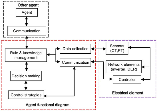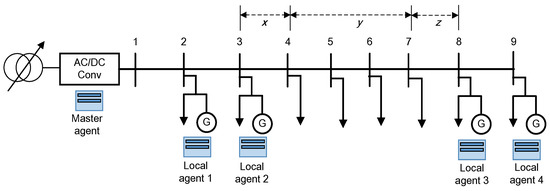 Figure 3 shows the structure of the MAS-based voltage control system. Control agents are classified into two types such as master and local agents. Physically, the master agent links to the controller of the main AC/DC converter and local agents are connected to DER controllers or important monitoring points in the distribution lines. Figure 4 shows an architecture of a control agent for DC distribution network application. The control agents are composed of three main functions: communication, data collection and computation functions. The communication part has two main actions: (1) connection to the other agents to negotiate and exchange data for coordinated tasks and (2) integration with the controller of the AC/DC converter or DER. The data collection function is to measure local data with sensors such as potential transformers (PTs) and current transformers (CTs). The computation function is to monitor voltage events, to calculate power flow analysis, and to make decisions for voltage control actions. Local agents monitor the voltage events and estimate the system parameters to construct the Jacobian matrix. We implemented the decision-making process in the master agent that can assign the dedicated tasks to AC/DC converter and/or DERs to accomplish system wise-voltage control schemes.
