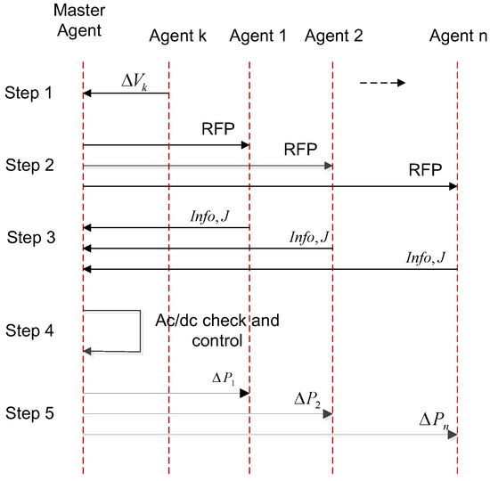 - Step 1: In normal state, all the agents operate in monitoring mode and measures local voltages. If the measured voltages exceed the normal limits, which is normally ±5% of the rated voltage, the local agents inform the master agent of the voltage problem via request messages with the voltage deviation (ΔVk).